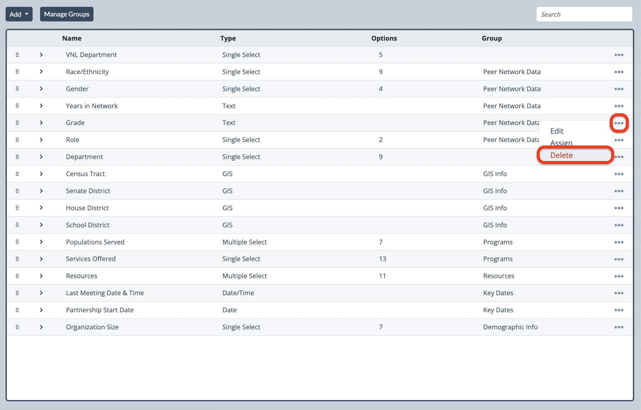 3. Find the attribute you want to delete, and click the 'more options' icon to the right of it. Then click "Delete" in the dropdown menu.